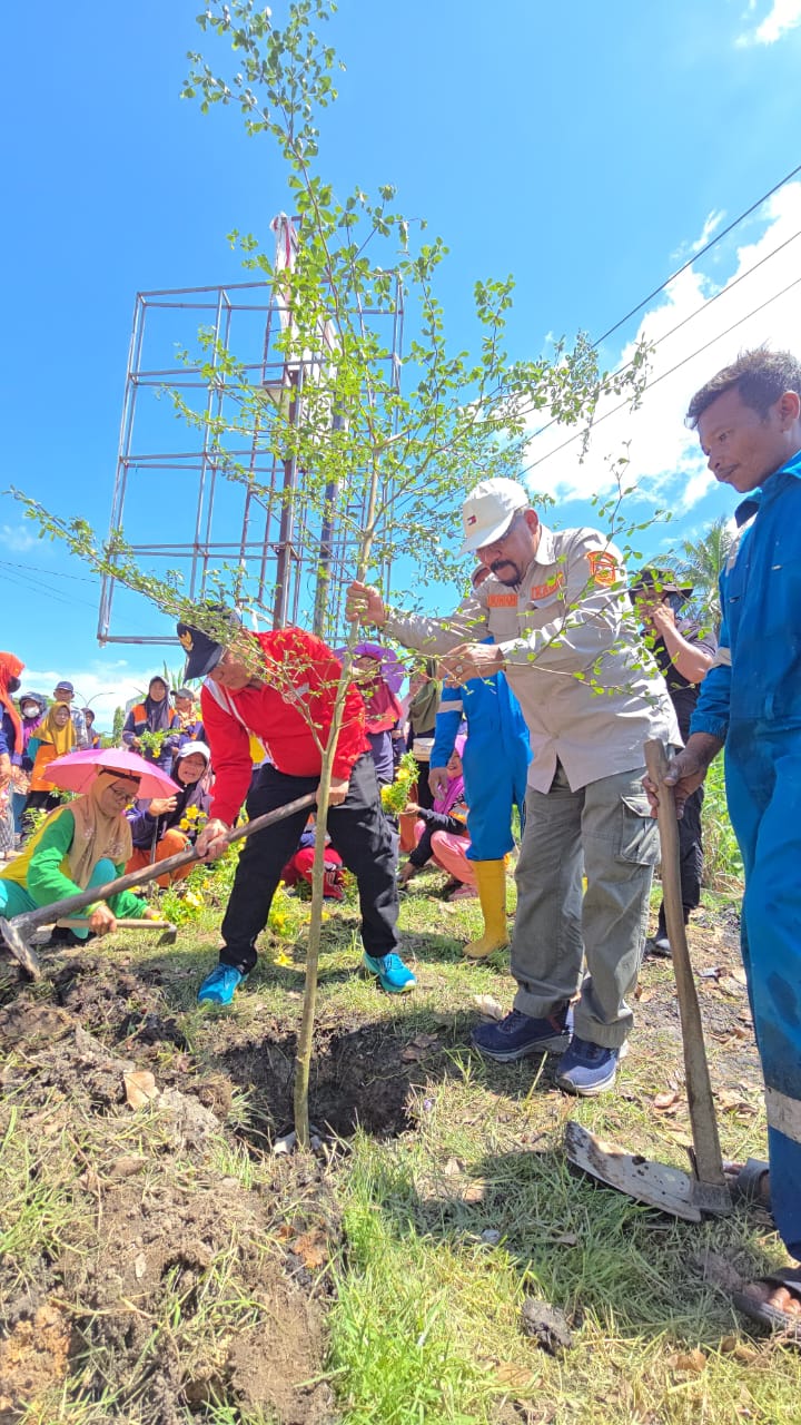 ” Hari ini kami bersama pak Bupati melakukan gotong royong bersama dengan agenda Penanaman pohon Ketapang sebanyak 100 batang, menanam bunga Alamanda/trompet kuning, serta pembersihan parit dan pemotongan rumput. adapun kegiatan ini dalam rangka gotong royong bersama petugas kebersihan dan Taman Batu 7,” Jelas Suwandi.