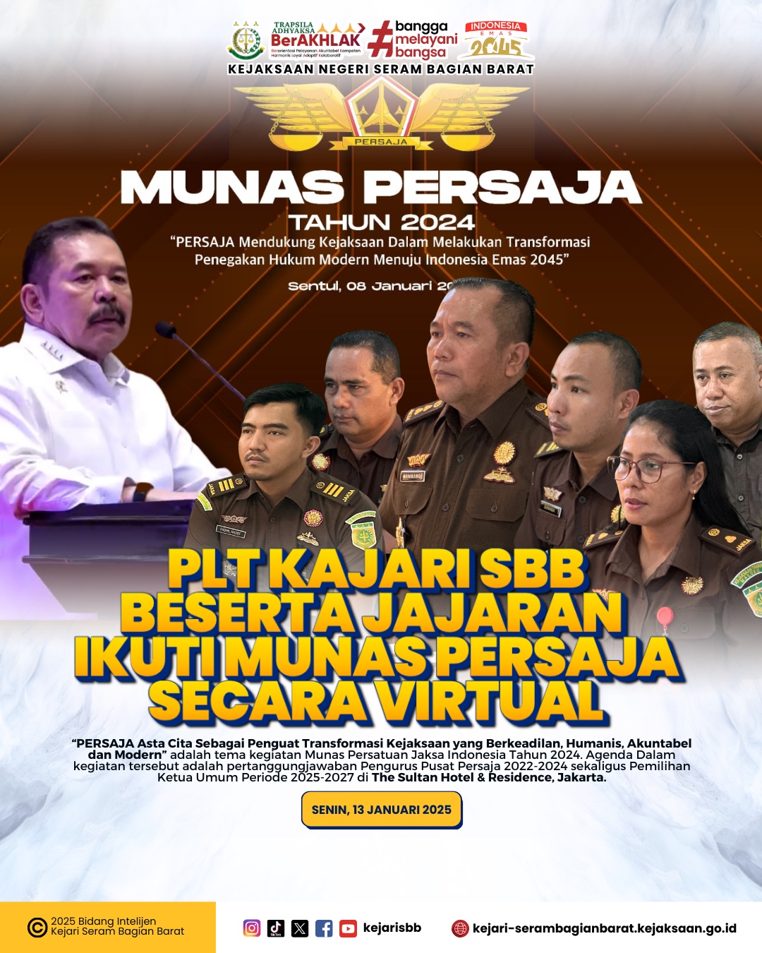 Seram Bagian Barat- Senin, 13 Januari 2025 Musyawarah Nasional PERSAJA Tahun 2024 dilaksanakan di The Sultan Hotel & Residence Jakarta. Kegiatan tersebut dilaksanakan bersama seluruh jajaran beserta Kepala Kejaksaan Tinggi se-Indonesia. Plt. Kepala Kejaksaan Negeri Seram Bagian Barat Bambang Heripurwanto, S.H., M.H juga bersama jajaran juga mengikuti kegiatan tersebut melalui Zoom Video Conference di Ruang Vidcon Kejari Seram Bagian Barat.
