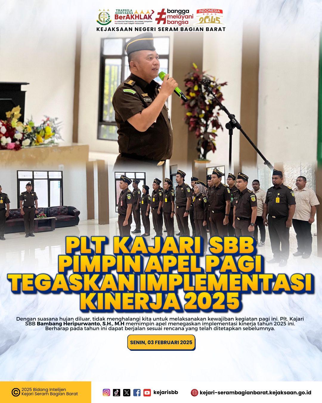 Seram Bagian Barat- Senin, 03 Februari 2025 bertempat di Aula Kantor Kejaksaan Negeri Seram Bagian Barat, Plt. Kepala Kejaksaan Negeri Seram Bagian Barat Bambang Heripurwanto, S.H., M.H memimpin apel senin pagi diawal bulan ini diikuti oleh para Kasi/kasubagbin, para Kasubsi/kaur, para Jaksa Fungsional dan seluruh Staff Kejaksaan Negeri Seram Bagian Barat.