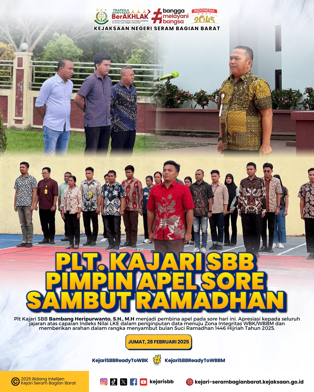Seram Bagian Barat- Jumat, 28 Februari 2025 Plt. Kajari SBB Bambang Heripurwanto, S.H., M.H memimpin apel sore diikuti oleh para kasi dan jajaran. Dalam apel ini, beliau berikan apresiasi diberikan kepada seluruh pegawai atas kinerja dalam rangka mendapatkan predikat WBK/WBBM dengan nilai LKE 101,3% dan menegaskan kembali arahan Jaksa Agung dalam kunjungan kerja virtual siang tadi.