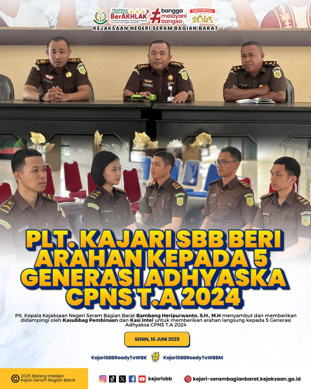 Seram Bagian Barat, Piru- Senin, 16 Juni 2025 bertempat di Aula Kejari SBB Plt. Kepala Kejaksaan Negeri Seram Bagian Barat Bambang Heripurwanto, S.H., M.H dan didampingi oleh Kasubbag Pembinaan dan Kasi Intel untuk memberikan arahan langsung kepada 5 Generasi Adhyaksa CPNS T.A 2024.
